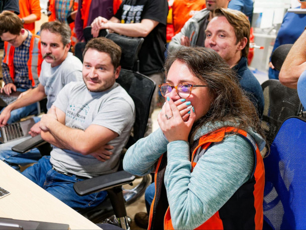 The Rubin team in the control room on Cerro Pachón reacts to seeing the first on-sky engineering data captured with the LSST Camera on April 15, 2025. (Photo: RubinObs/NOIRLab/SLAC/DOE/NSF/AU)