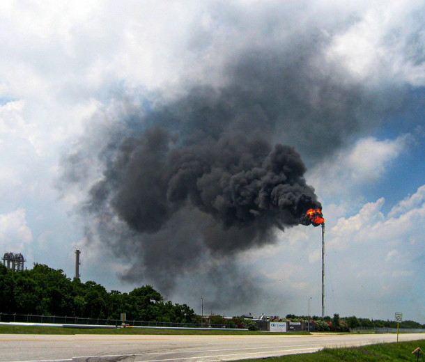 Pictured above is a gas flare from the Bayport Industrial District in Harris County, Texas, an area with a concentration of petrochemical companies. As part of a series of executive orders, the Trump administration declared a national energy emergency, supporting the domestic production of fossil fuels. (Photo: Jim Evans, Wikimedia Commons, CC BY SA 4.0)