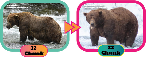 Before and after photos of 32 Chunk, this year’s Fat Bear Week bracket champion. 32 Chunk had been runner up in years past. (Graphic: Courtesy of explore.org)