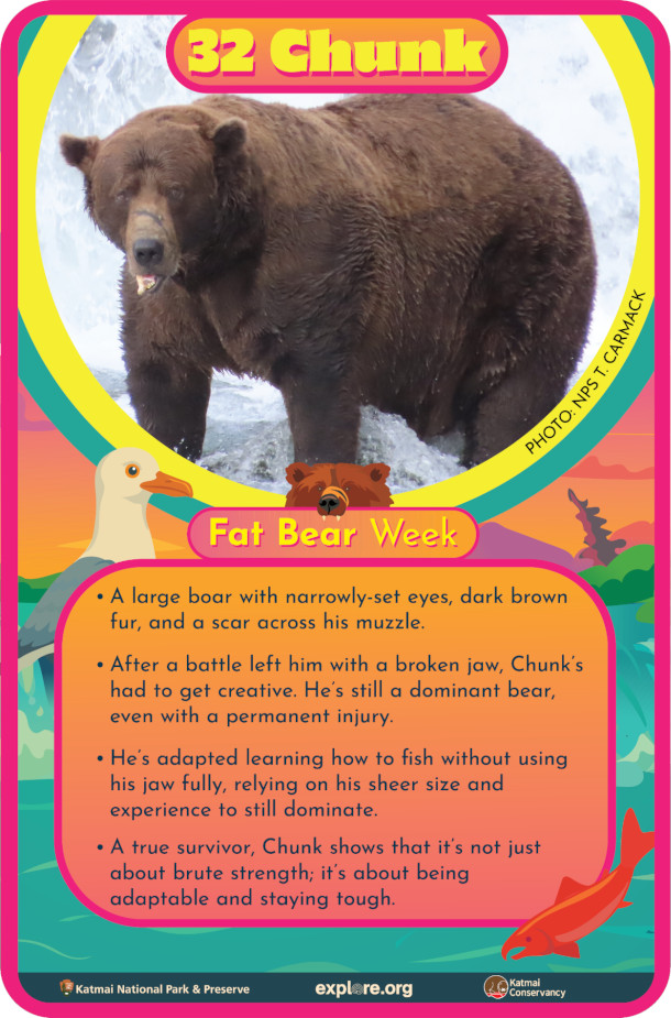FITZ: He's one of the largest bears at Brooks River, and has been so for a number of years. So Chunk is a big bear, like a 1200 pounder at least. He's probably fatter than that, but we don't know for sure, but at least 1200 pounds. He's one of the more dominant bears at the river. He's been the river's most dominant bear, like last year in 2024 he was. This year, however, he had a pretty severe setback in June when he broke his jaw. We don't know how he broke his jaw, but the timing of it and the nature of the injury strongly suggest he broke it in a fight with another bear. So he's had to deal with the pain, the suffering, but Chunk is powering through it, and he's done so throughout the year. He's gotten really, really fat, and he's done remarkably well for himself this year. So I think with his, his resilience, his perseverance, I think that story resonated with a lot of Fat Bear Week voters. And Chunk has been like the runner up, I think, the past two years in 2023 and 2024, so this seemed like it was his year.