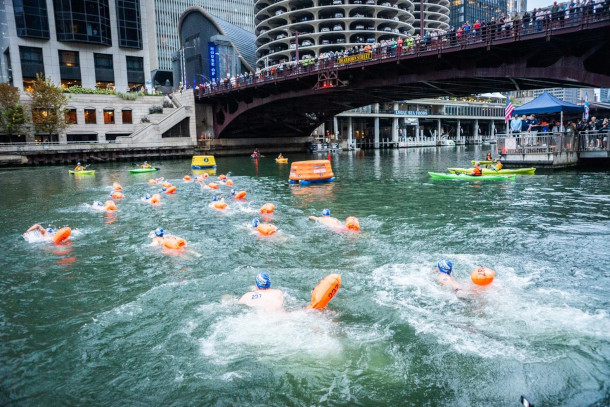 Swimmers race in the Chicago River in an event to raise money for ALS research. The next Chicago River public swim is scheduled for Sept. 20, 2026. (Photo: Chris Costoso)