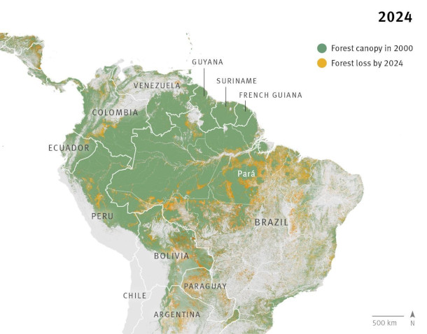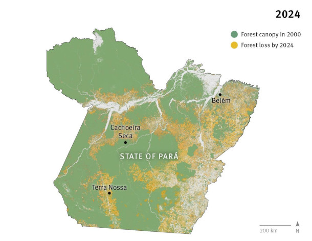 Map of the State of Pará, which will host COP30 Brazil this fall in Belem. The map shows the decline of the forest in the past 24 years, in part due to the invasion of illegal cattle ranches and other agricultural industries. (Photo: Courtesy of Human Rights Watch)