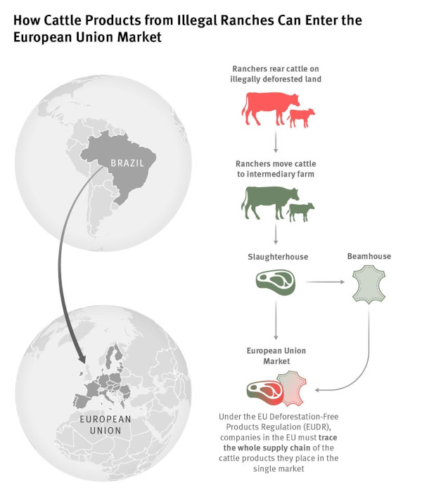 This infographic shows how cattle products from illegal ranches in Brazil can enter the European Union Market as steak and handbags. The EU is scheduled to begin enforcing its anti-deforestation regulations in January 2026. (Photo: Courtesy of Human Rights Watch)