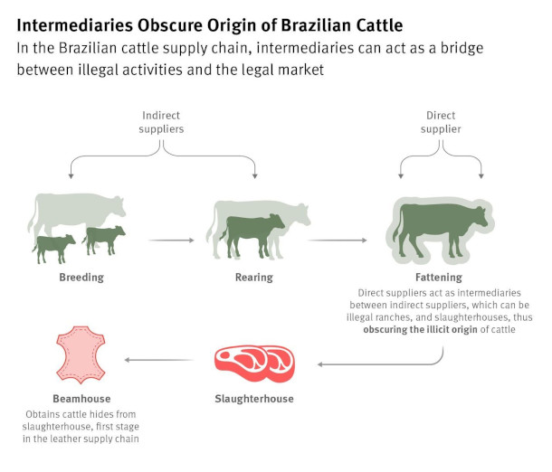 CHÁVEZ: We're not able to show definitively that JBS bought the cattle that was illegally raised in these ranches. But the thing is, JBS is also not able to definitively rule out that that illegal cattle is in their supply chain. So let me explain quickly how that goes. You have these illegal ranches operating in these protected forests, and they will sell to one or several intermediary ranches, and those ranches at the end, they are the direct suppliers for JBS. So they are the ranches that JBS directly purchases cattle from. Now, JBS traces its direct suppliers. That means it analyzes which ranches it is buying from directly and whether they comply with some sustainability and human rights criteria, but it doesn't extend that analysis to its indirect suppliers. So those are basically the in the case I just described, those would be potentially the illegal cattle ranches operating in Terra Nossa and Cachoeira Seca, so the fact that JBS doesn't have visibility over its entire supply chain does not allow it to rule out that it may be acquiring cattle that's coming from illegal ranches, and that's the problem that we highlight in the report.