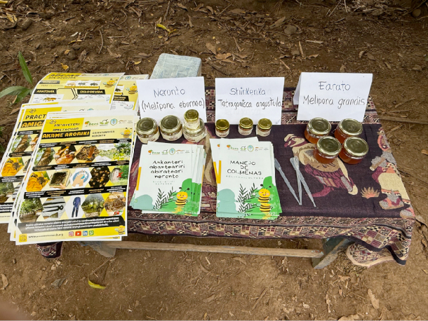 Some of the local indigenous communities in the Peruvian Amazon region sell stingless bee honey, which has been a part of their cultural medicinal practices for millenia. Two of the Peruvian scientists that Teresa Tomassoni interviewed, Rosa Vásquez Espinoza and Cesar Delgado, have found molecules in some of this honey with a number of medicinal properties, such as antibacterial, antifungal, and anti-inflammatory. (Photo: Teresa Tomassoni, Inside Climate News)