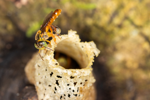 Tetragonisca angustula, also known to locals as “angelitas”, or “little angels”. Here, a worker bee perches at the entrance of a wild nest. (Photo: Kathryn Naherny)
