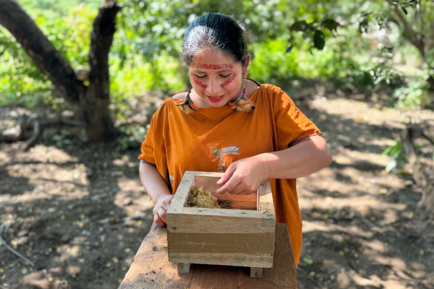 Asháninka stingless beekeeper Micaela Huaman Fernandez inspects a hive of Tetragonisca angustula bees. (Photo: Teresa Tomassoni, Inside Climate News)