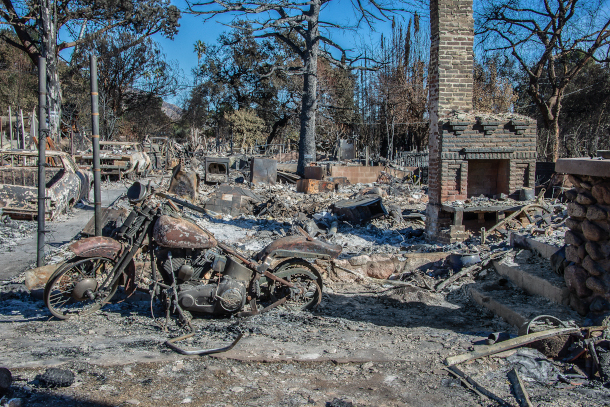 The aftermath of the January 2025 fires in Altadena, CA. When extreme wildfires burn materials like cars, bicycles, and household materials, the resulting smoke could contain potentially toxic materials. (Photo: Russ Allison Loar, Flickr, CC BY-NC-ND 2.0)