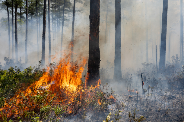 Fire consumes low-level brush during the 2025 NASA FireSense research campaign, centered around prescribed burn operations at Fort Stewart-Hunter Army Airfield in Georgia. Prescribed burns can potentially reduce excess fuel in forests and prevent extreme wildfires. (Photo: NASA/Milan Loiacono, Wikimedia Commons, Public domain)