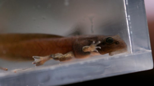 A coastal tailed froglet, pictured mid-transformation from tadpole into adult frog. Coastal tailed frogs are one of the species that live in stream ecosystems throughout the Oregon Cascades. (Photo: Evan Rodriguez, OPB)