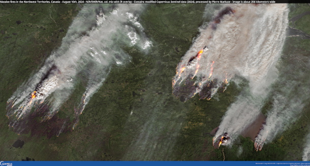 Satellite imagery of smoke from wildfires spreading through Canada’s Northwest Territories, August 10, 2024. (Photo: Pierre Markuse, Wikimedia Commons, CC BY 2.0)
