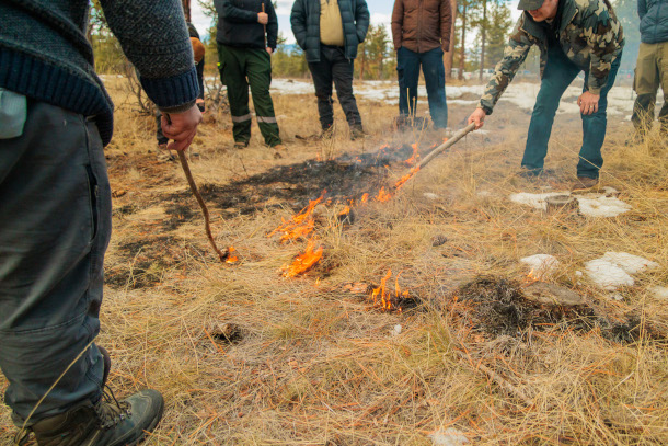 Cultural burning hands-on practice during a fire camp at First Nations’ Emergency Services Society of British Columbia (FNESS) in Cranbrook, BC. (Photo: Jordan Melograna, Indigenous Leadership Initiative)