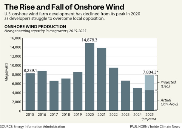 This graph, using data from the Energy Information Administration, shows the last decade of wind farm development in terms of generating capacity. After reaching a peak in 2020, the decline since then has been significant. (Graphic: Paul Horn, Inside Climate News)