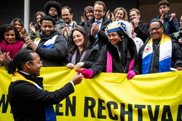 Bonaire plaintiffs, Greenpeace officials, lawyers, and supporters gathered outside District Court in The Hague in October 2025 when the court heard arguments in the lawsuit. In front of the banner: Churmer Bomba, a community mobilizer with Greenpeace. Behind the banner, from left to right: Plaintiff Kjelld Kroon, Greenpeace Netherlands Director Marieke Vellekoop, plaintiffs Jackie Bernabela and Onnie Emerenciana. (Photo: Marten van Dijl, Courtesy of Greenpeace)