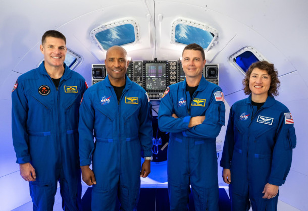 From left to right: Canadian Space Agency astronaut Jeremy Hansen, and NASA astronauts Victor Glover, Reid Wiseman, and Christina Hammock Koch, are the four astronauts who will venture around the Moon on Artemis II. (Photo: James Blair, NASA, JSC, Public Domain)