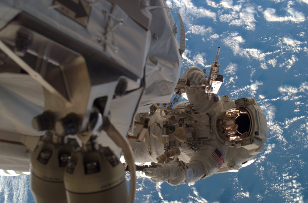 Danny Olivas at the end of the Integrated Truss Structure of the International Space Station installing the inboard starboard solar array in 2007. (Photo: NASA, Public Domain)