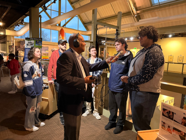 Living on Earth host Steve Curwood interviews the UNH Astronomy club. (Photo: Jennifer Stevens-Curwood)