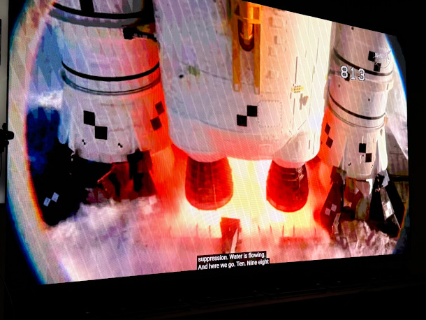 The Artemis II launch as seen on screen at the watch party. (Photo: Jennifer Stevens-Curwood)