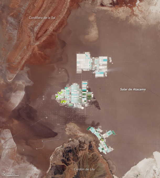 An aerial view of the Salar de Atacama shows the brightly colored evaporation ponds that companies like SQM and Albemarle use to extract lithium from brine. (Photo: NASA Earth Observatory, Wikimedia Commons, Public Domain)